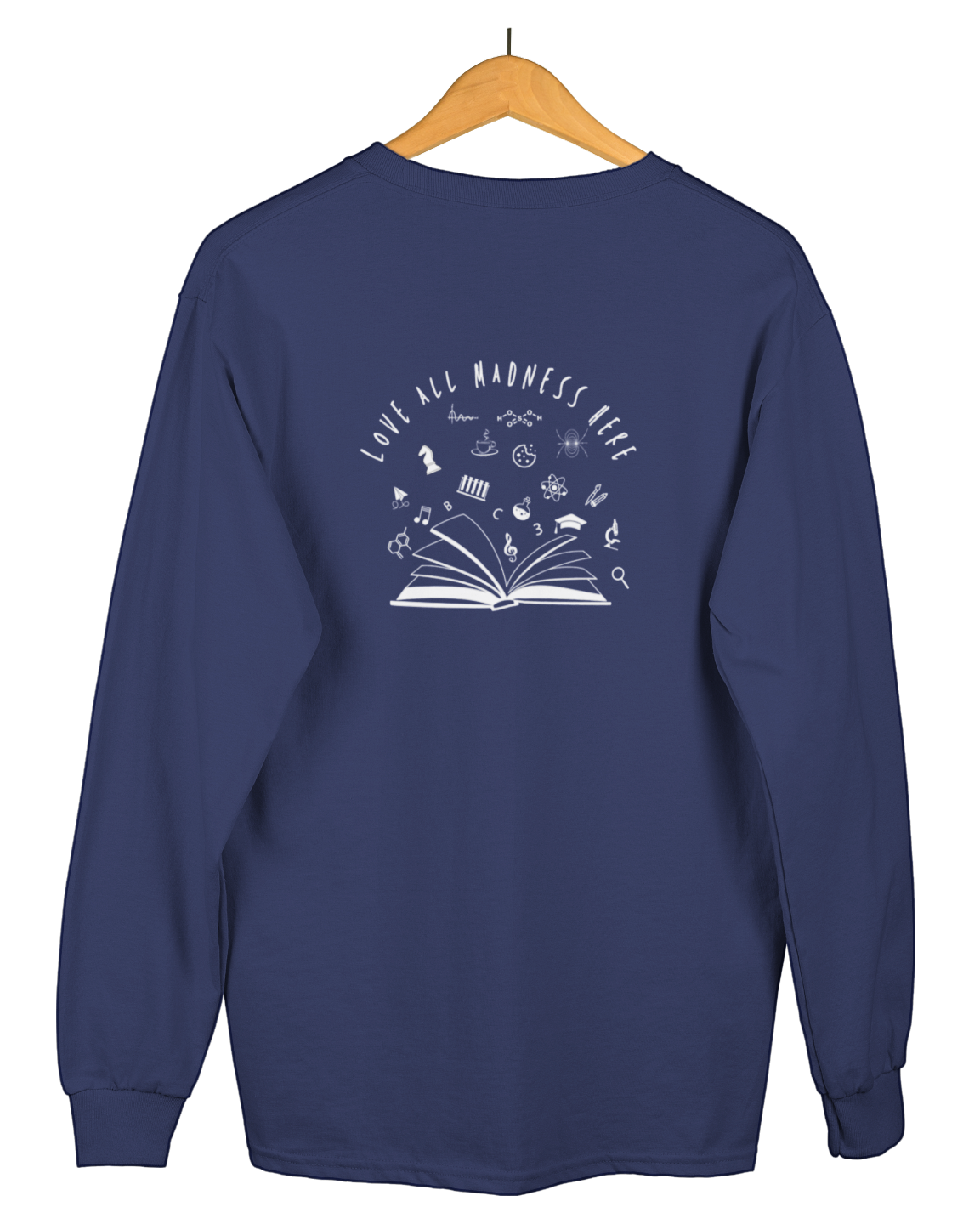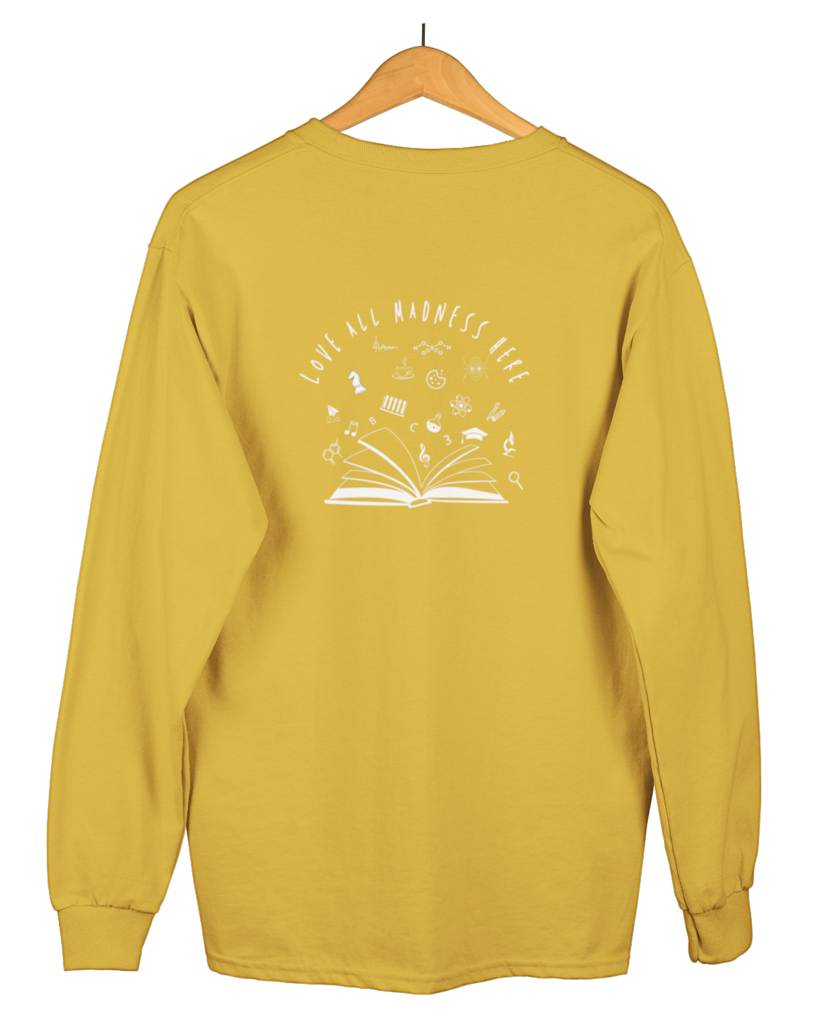 - Design Highlights: Features an open book surrounded by symbols of science, music, art, and literature, with the inspiring phrase "Love All Madness Here."