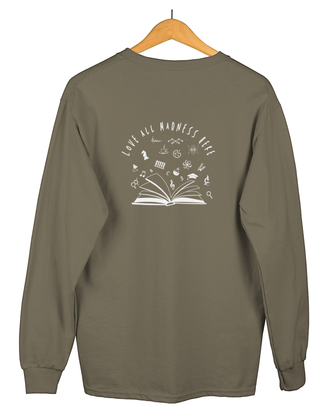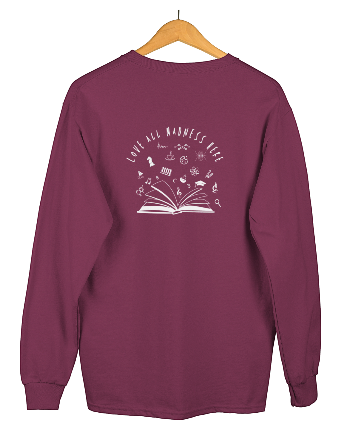 Celebrate the beauty of diverse passions with our "Love All Madness Here" Long-Sleeve T-Shirt, designed for those who embrace creativity, science, art, music, writing, reading, and more. This T-shirt is perfect for individuals who believe in the magic of combining intellect with imagination.